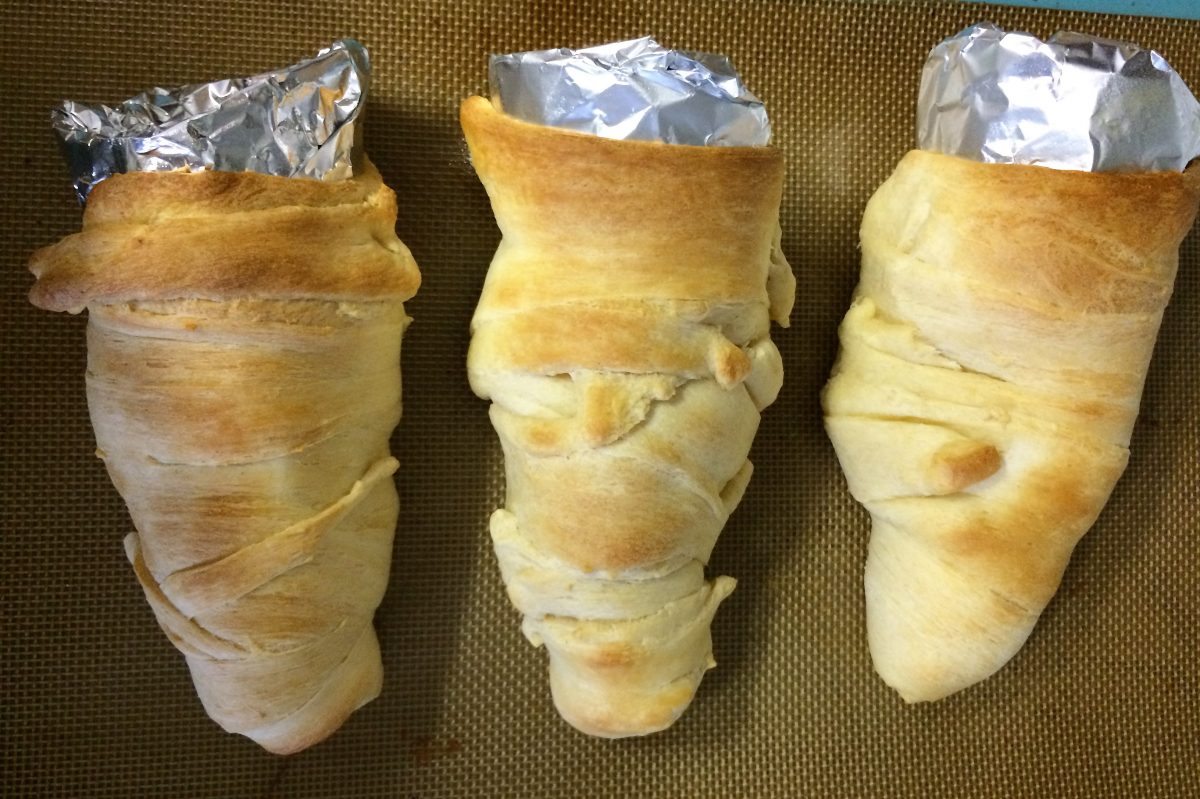 - When the foil was all greased up, we separated the sheet of crescent rolls into 3 equal parts and started molding them to the cones. You can cut them into “snakes” and wrap them that way, but we were more concerned with making sure everything was covered.