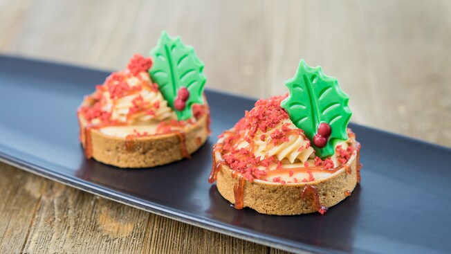 - Wreath Bundt Cake: Cinnamon and candied pecan bundt cake with a crème brûlée center topped with green icing, red chocolate pearls, and red mousse