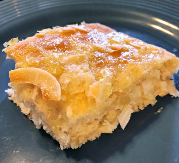 We don’t have a 9″ x 13″ pan, so I used my deepest cookie sheet. I still think it worked well. Even with the pineapple and coconut mixture leaking a little bit, it wasn’t enough to cause a problem.