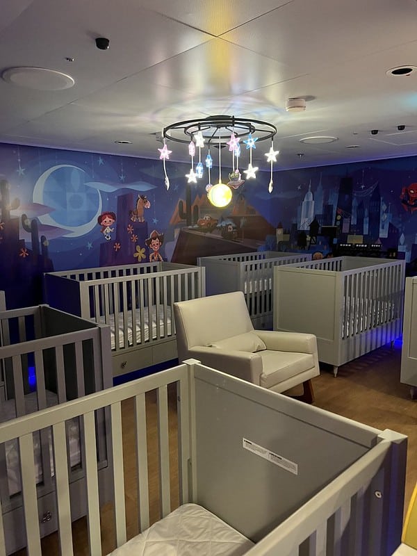 There are multiple areas for kids to go and hang out, without their parents. And most of them are free. However, the “It’s a Small World” Nursery, which is for kids ages 6 months through 3 years old, is the only childcare area that comes with hidden costs.