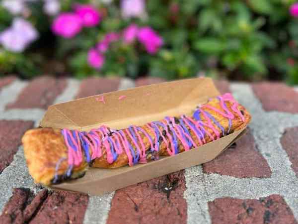 The Cheshire Cat Tail is as fun as it is delicious! This flaky, buttery pastry is filled with sweet chocolate chips and topped with bright pink and purple icing that gives it that signature Alice in Wonderland charm.